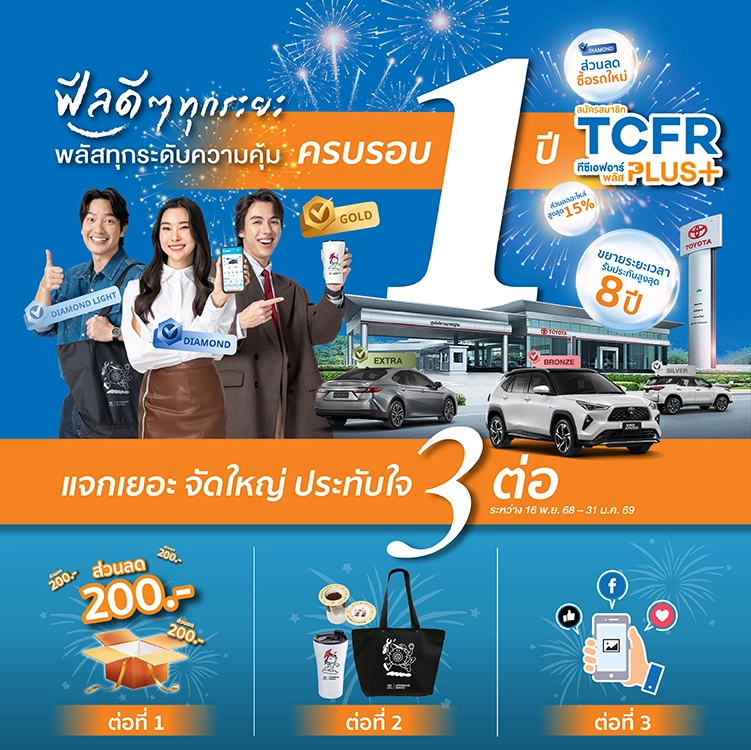 (สำหรับการใช้สิทธิ์ระหว่างวันที่ 1 พฤศจิกายน 2568 - 4 มกราคม 2569 สิทธิ์ประโยชน์ดังกล่าวอาจมีการปรับเปลี่ยนรายเดือน)รุ่นรถยนต์ ส่วนลดต่อคัน Fortuner 20,000 Camry 20,000 Innova Zenix 20,000 Alphard & Vellfire 40,000 Corolla Altis 10,000 Hilux Travo 10,000 Veloz 10,000 Corolla Cross 10,000 Hilux Champ 10,000 Majesty 20,000 Yaris Ativ hybrid 10,000 - 6.2) รับรหัสส่วนลดได้โดยผ่านแอปพลิเคชัน T-Connect สำหรับลูกค้าที่ยอมรับข้อตกลงและเงื่อนไขเพื่อเข้าร่วมโปรแกรม TCFR Plus+ โดยกลุ่มลูกค้าไดมอนด์และไดมอนด์ไลท์จะได้รับคูปองสิทธินี้อัตโนมัติ (สามารถเช็คได้จากแท็บ Coupon Available)